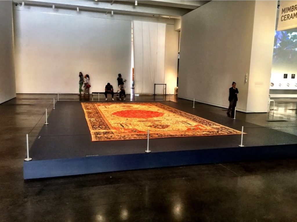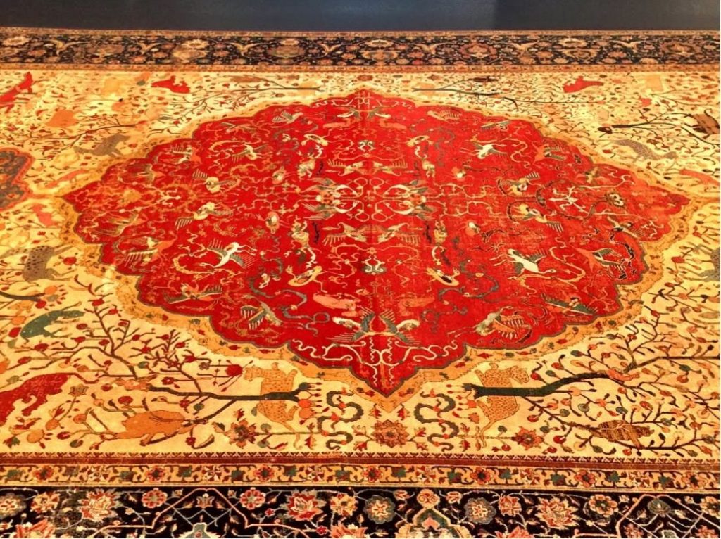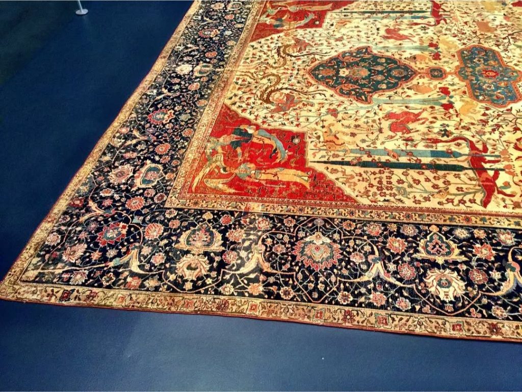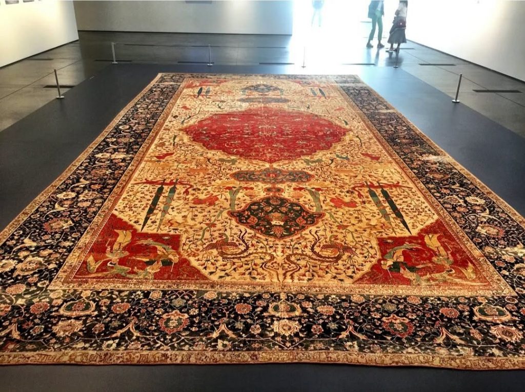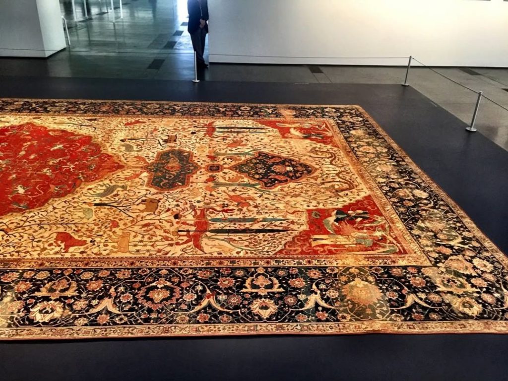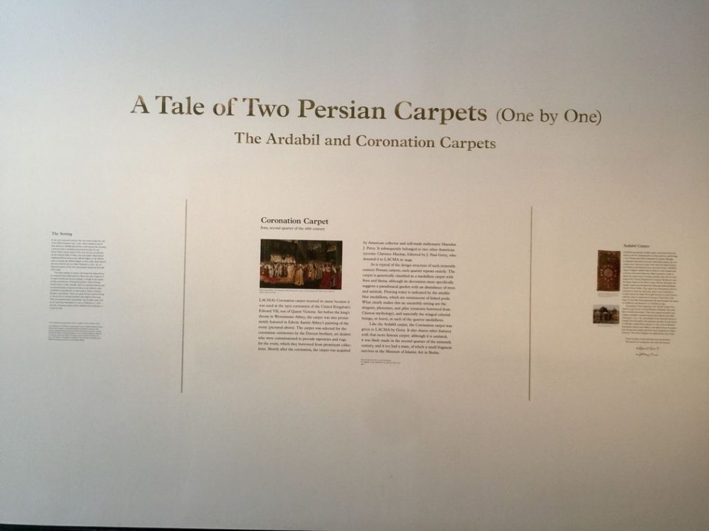 دو فرش بسیار مهم این دوره، قالی اردبیل و فرش تاجگذاری، در موزه لاکما نگهداری میشوند و امسال بعد از سالها به نوبت به نمایش عمومی در آمدند. قالی تاجگذاری به این علت به این نام مشهور شده که در مراسم تاجگذاری یکی از پادشاهان انگلستان استفاده شده بود. بیشک یکی از زیباترین فرشهای دوره صفویست؛ با ترنجی بزرگ در میان و چهار لچک در گوشهها. عناصر تزئینی آن دوره چون فرشتگان، سروها، اژدها، سیمرغ و حیوانات مختلف در سراسر قالی که از هر دو طرف قرینه است به چشم میخورد.
