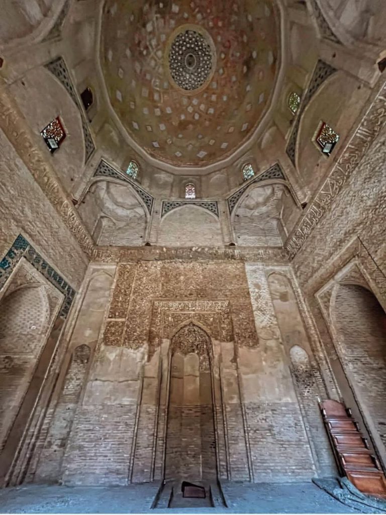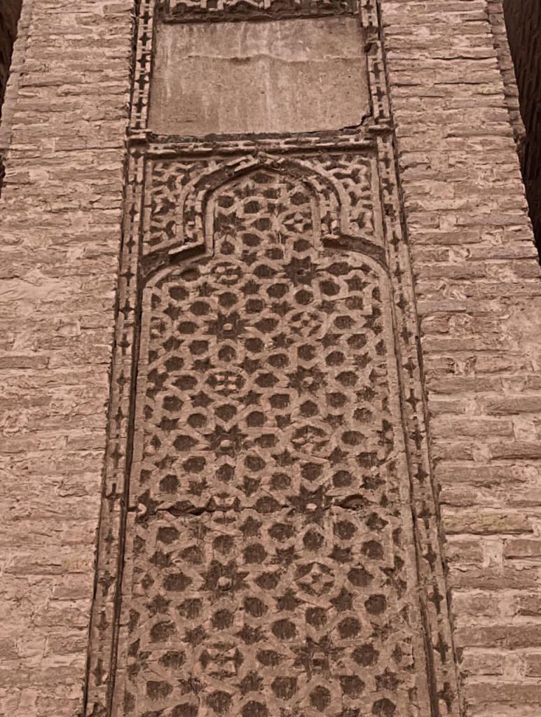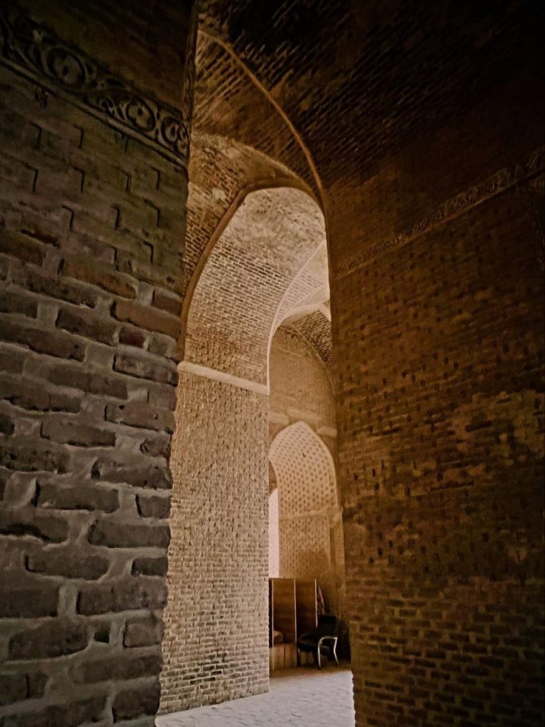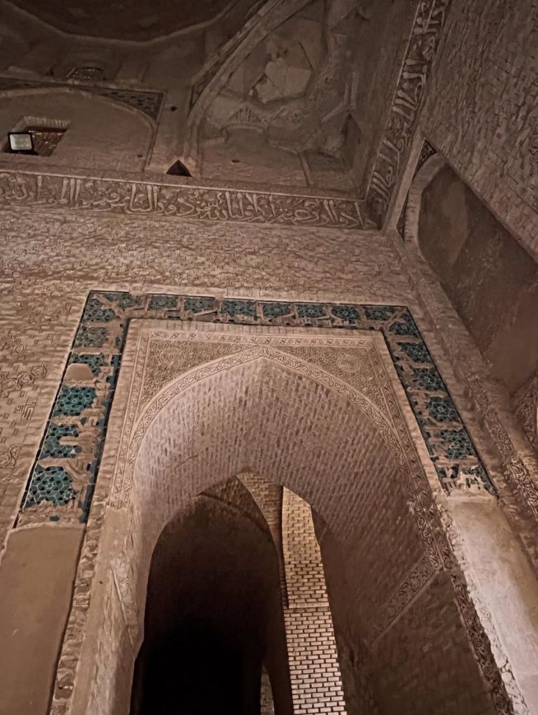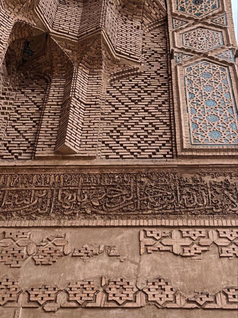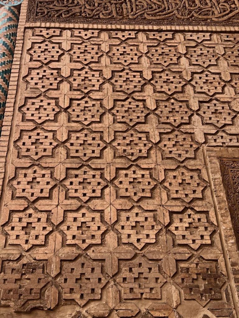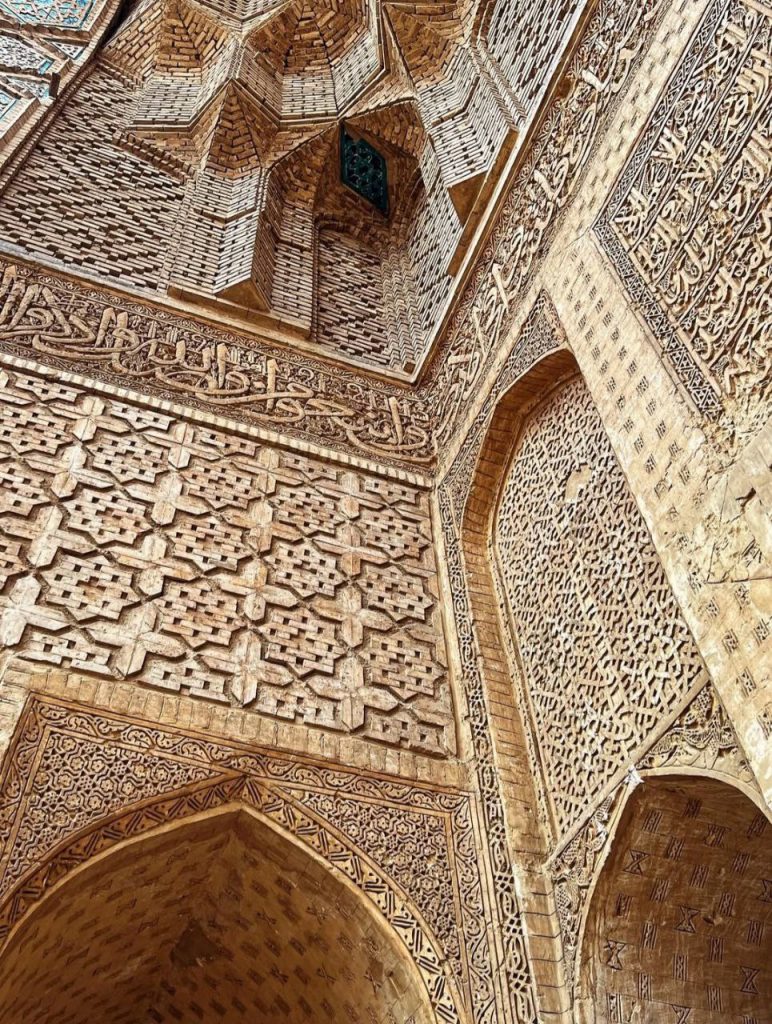 در بدنه ایوانها و دیوارها، آجر نه تنها مصالح اصلی سازه است بلکه به صورت نقشی تکرار شونده، هندسی و در همتنیده، ارزش تزئینی مییابد. در مقابل، گچبریها در سطوحی خاص – به ویژه محراب – چنان ظریف و چندلایهاند که از دور یک سطح واحد مینمایند اما در نگاه نزدیک، جهان پیچیدهای از اسلیمی، کتیبه، گره و شبکه را آشکار میکنند. این محراب چندلایه یکی از اوجهای هنر ایلخانی است؛ گویی گچ نه مصالح که مادهای برای ترسیم نور و سایه بوده است.