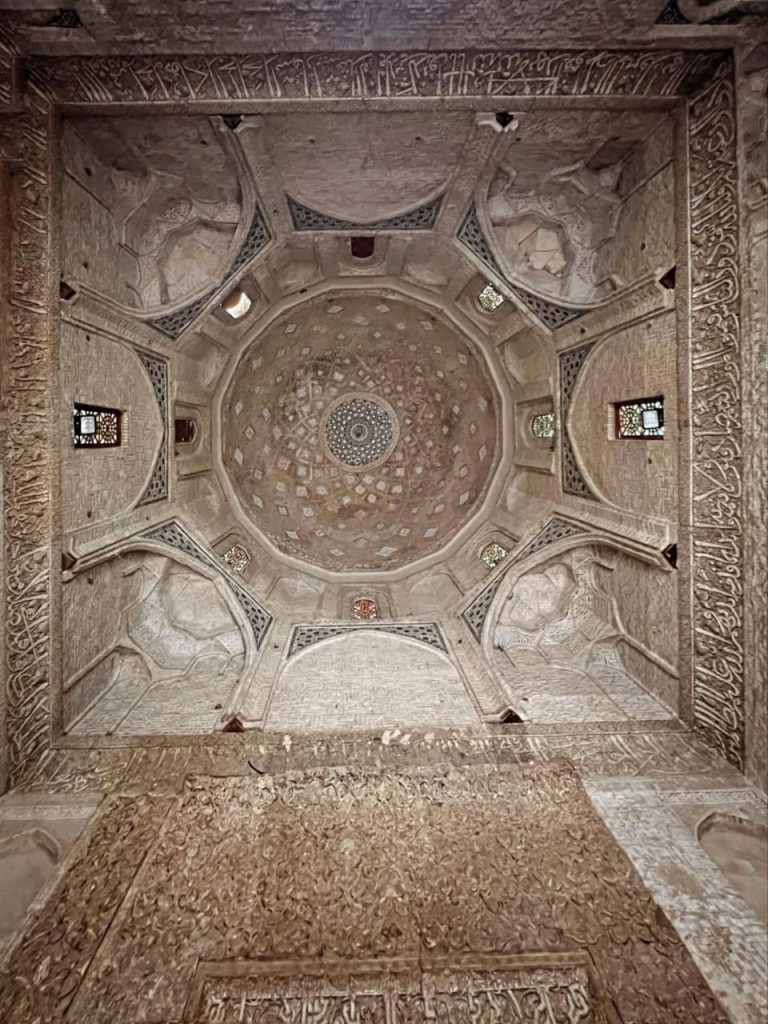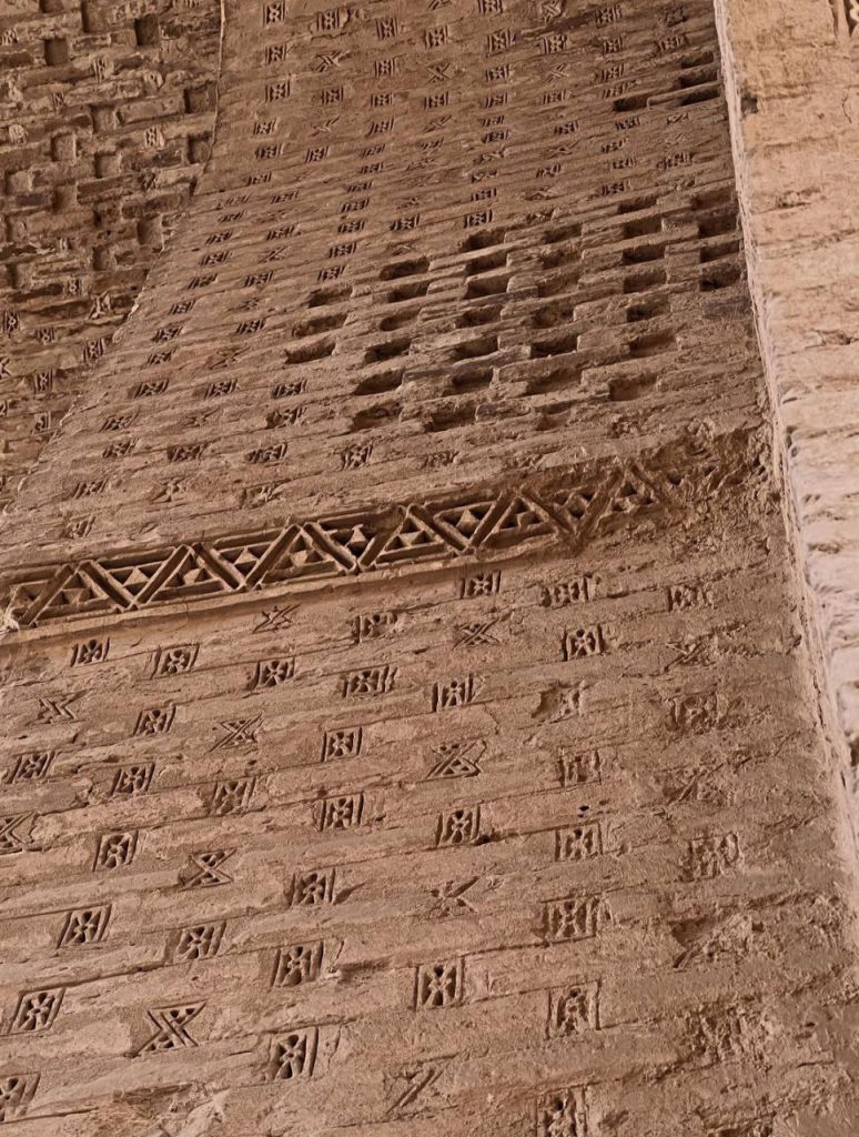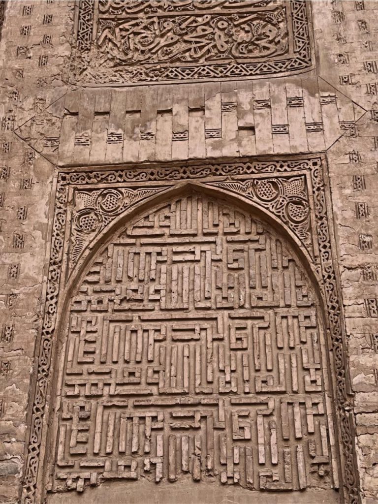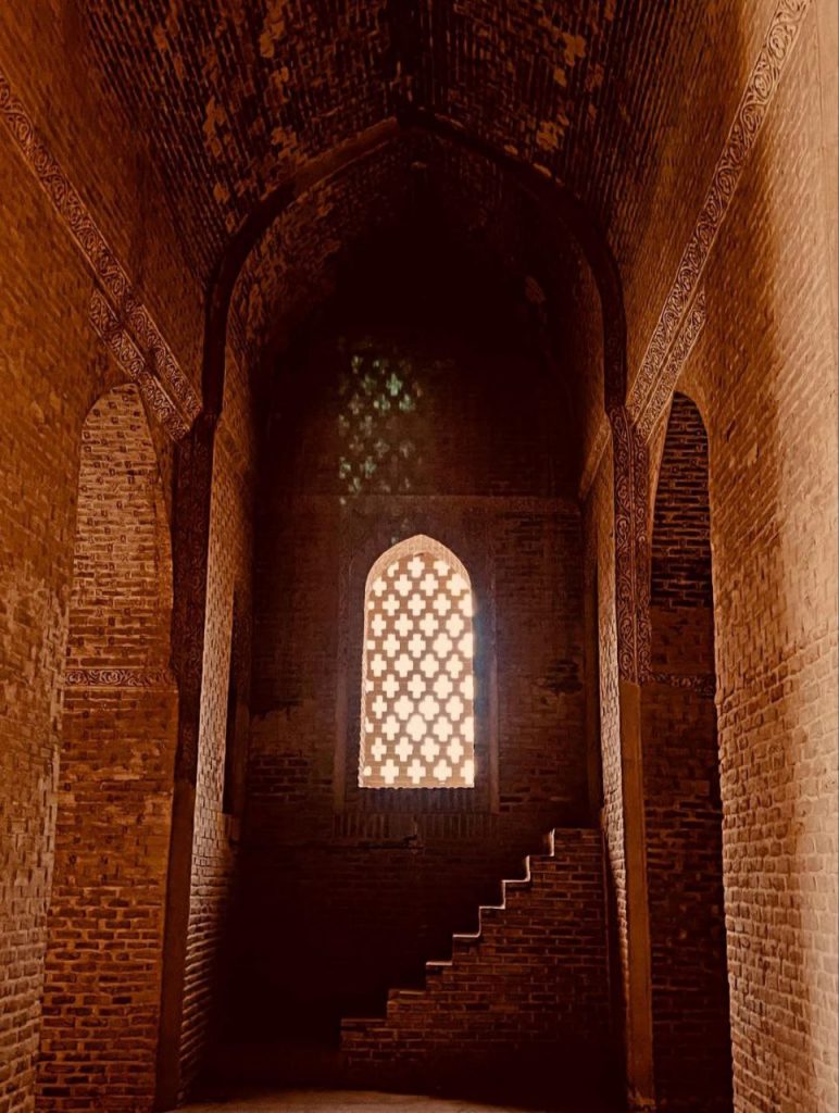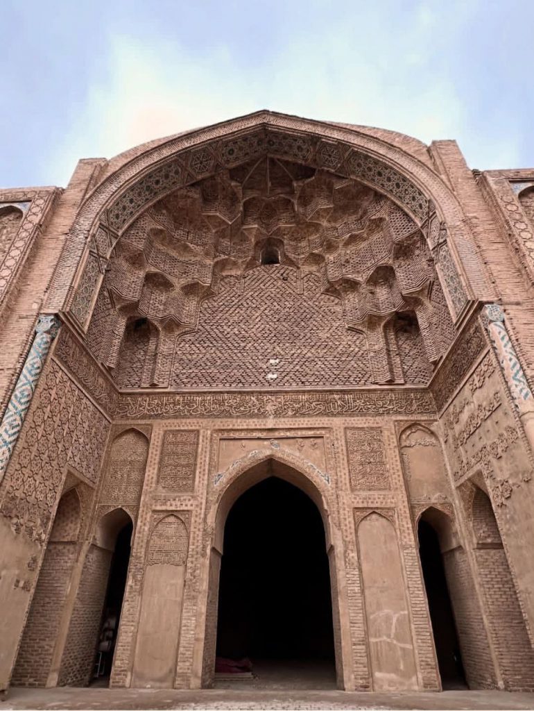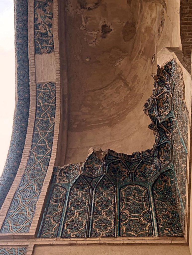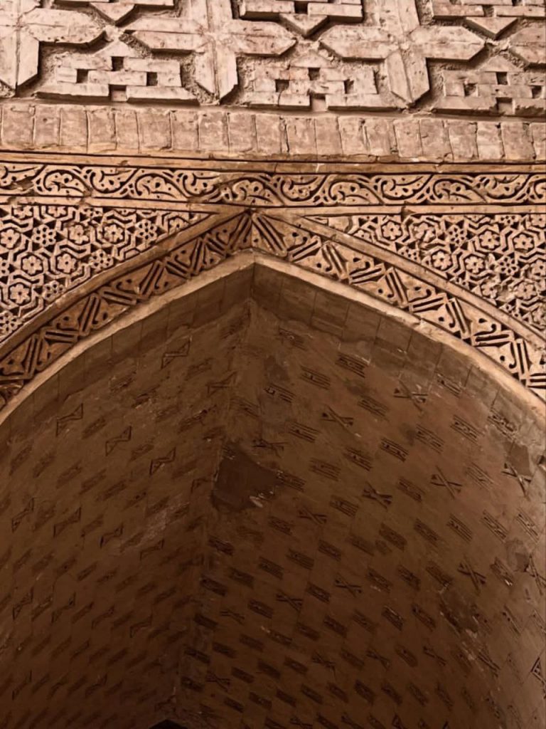 در بدنه ایوانها و دیوارها، آجر نه تنها مصالح اصلی سازه است بلکه به صورت نقشی تکرار شونده، هندسی و در همتنیده، ارزش تزئینی مییابد. در مقابل، گچبریها در سطوحی خاص – به ویژه محراب – چنان ظریف و چندلایهاند که از دور یک سطح واحد مینمایند اما در نگاه نزدیک، جهان پیچیدهای از اسلیمی، کتیبه، گره و شبکه را آشکار میکنند. این محراب چندلایه یکی از اوجهای هنر ایلخانی است؛ گویی گچ نه مصالح که مادهای برای ترسیم نور و سایه بوده است.