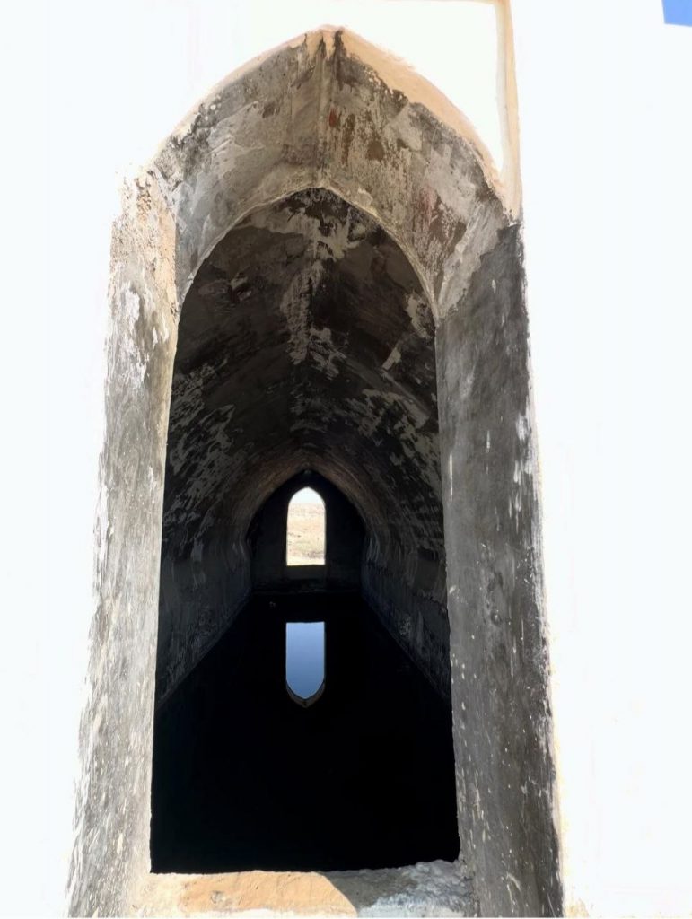 در دستهی دیگر، آبانبار با گنبدی مخروطی-نیمکروی بر سکویی سنگی قرار گرفته است. این فرم، علاوه بر استحکام سازهای، سطح تماس با تابش خورشید را به حداقل میرساند و آب باران را به سوی پیرامون بنا هدایت میکند. جویهای سنگی اطراف، بخشی جداییناپذیر از معماریاند و آب را به نرمی و بدون اتلاف به مخزن منتقل میکنند. دهانههای کوچک و محدود، امکان تهویهی طبیعی را فراهم کرده و مانع فاسد شدن آب می شوند؛ بینیاز از هر سازوکار مکانیکی یا مداخلهی بیرونی.