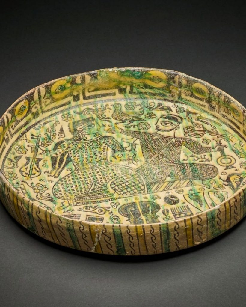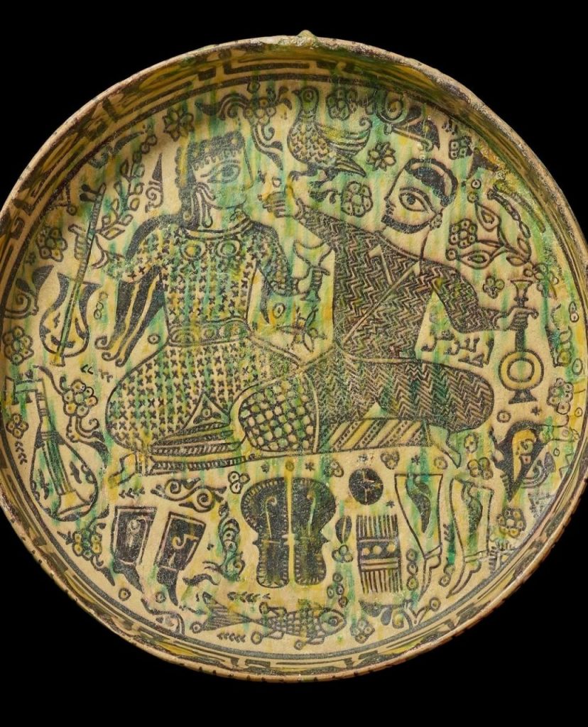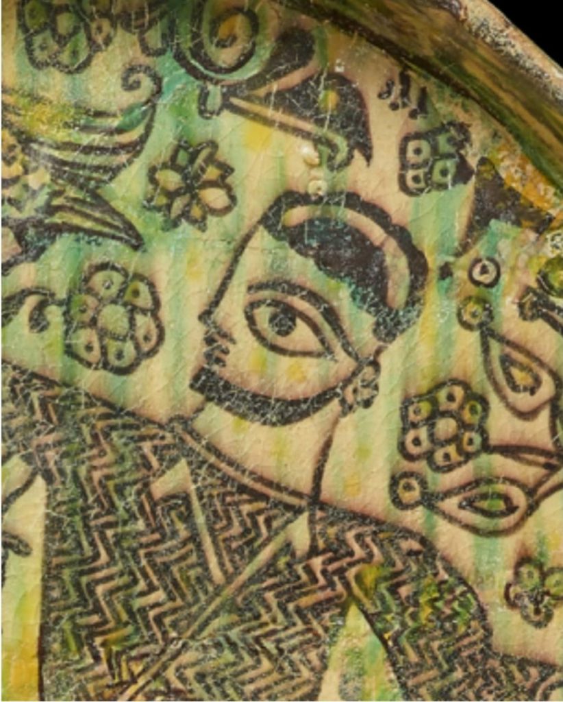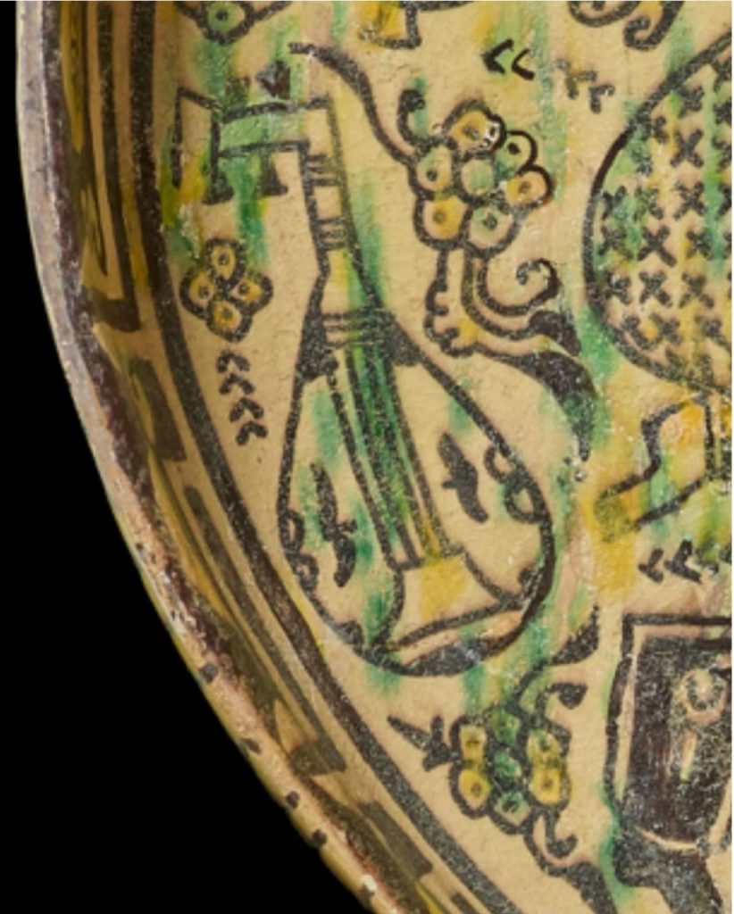 در کتاب مجموعه پلوتنیک تصویری از یک بشقاب ساخت خراسان با قطر ۳۴ سانتیمتر به چاپ رسیده که از بسیاری جهات قابل توجه است. این بشقاب به قرن چهارم هجری (دهم میلادی) تعلق دارد و احتمالا در نیشابور در قلمرو سامانیان ساخته شده است. در مرکز بشقاب زن و مردی به چشم میخورند که در کنار هم در طبیعت نشسته اند. صراحیای در دست چپ مرد دیده میشود و دست راستش حالت خطاب به زن را دارد. در زیر دست چپ او عبارت (نوش کن) نوشته شده و چکمه هایش در جلوی پایش بر روی زمین قرار دارد. زن در کنارش به او مینگرد و در یکدست جامی و در دست دیگرش سازی بدست دارد که با توجه به دو گوشی تصویر شده بر روی دسته ساز میتواند نیای دو تارهای خراسان امروزی باشد. آرایههای موی زن بر روی پیشانیش ریخته و گیسوان بلندش از پشتش در سمت راست دیده میشوند. در نزدیکی سازی که در دست دارد بربطی به چشم میخورد که ممکن است متعلق به مرد باشد و رامشگر بودن هر دو را در ذهن تداعی میکند. چکمههای او نیز بر روی زمین قرار گرفته و دو شی دیگر میان چکمههای این زوج تصویر شدهاند. هنرمند نقاش سفالگر پیرامون این دو را با گل و گیاه و پرندگان پر کرده و یک ماهی نیز در پایین صحنه دیده میشود که اشارتی به آبی روان دارد. چشمان درشت هر دو حکایتگر این است که اصول چهره پردازی شرق دور در خراسان آن روز رایج نبوده و چهرهها هنوز متاثر از اصول نقاشی عصر ساسانی بودند. تصویر بزم این دو دلداده در طبیعت همراه با شراب و موسیقی که بر روی این بشقاب کوچک تصویر شده یادگاری است از گوشه ای از زندگی اجدادمان در هزار سال پیش.