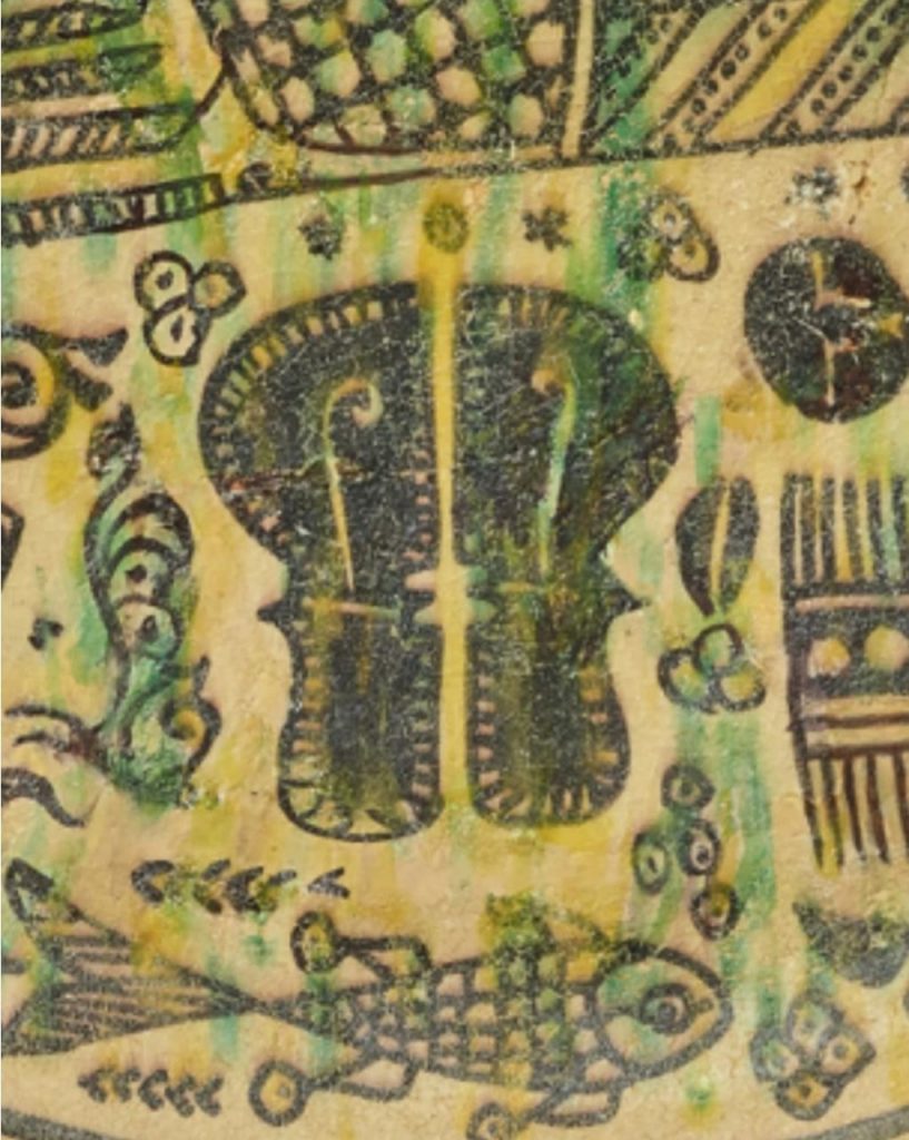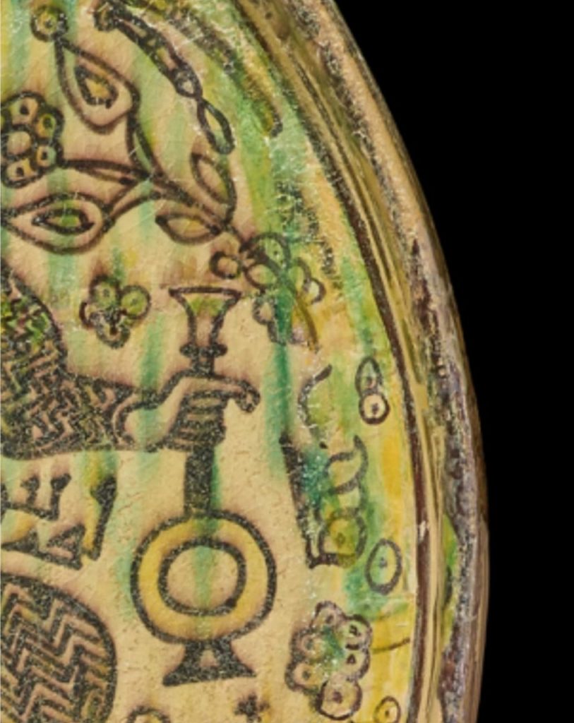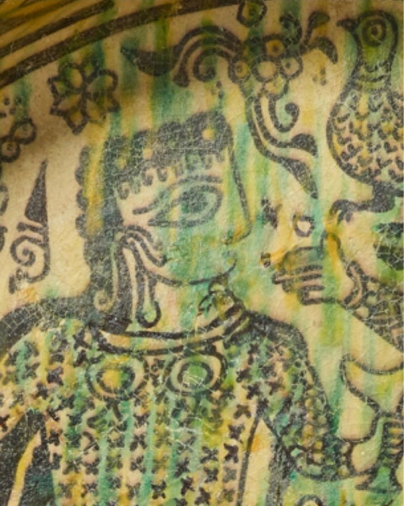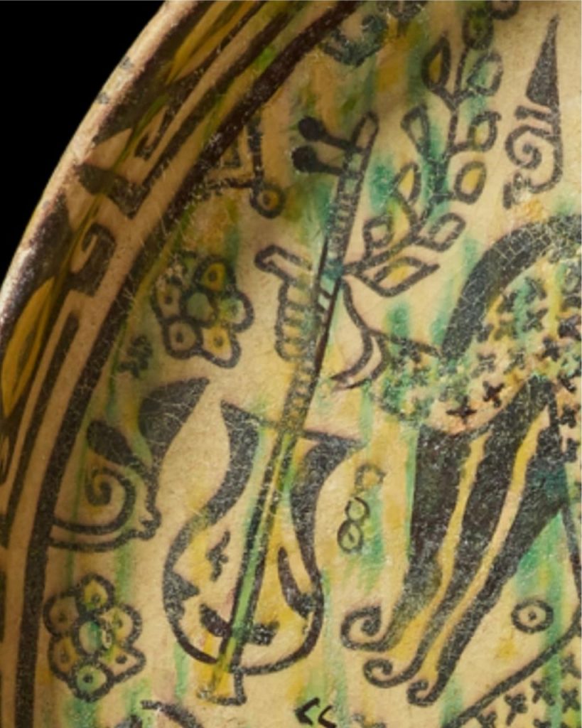 در کتاب مجموعه پلوتنیک تصویری از یک بشقاب ساخت خراسان با قطر ۳۴ سانتیمتر به چاپ رسیده که از بسیاری جهات قابل توجه است. این بشقاب به قرن چهارم هجری (دهم میلادی) تعلق دارد و احتمالا در نیشابور در قلمرو سامانیان ساخته شده است. در مرکز بشقاب زن و مردی به چشم میخورند که در کنار هم در طبیعت نشسته اند. صراحیای در دست چپ مرد دیده میشود و دست راستش حالت خطاب به زن را دارد. در زیر دست چپ او عبارت (نوش کن) نوشته شده و چکمه هایش در جلوی پایش بر روی زمین قرار دارد. زن در کنارش به او مینگرد و در یکدست جامی و در دست دیگرش سازی بدست دارد که با توجه به دو گوشی تصویر شده بر روی دسته ساز میتواند نیای دو تارهای خراسان امروزی باشد. آرایههای موی زن بر روی پیشانیش ریخته و گیسوان بلندش از پشتش در سمت راست دیده میشوند. در نزدیکی سازی که در دست دارد بربطی به چشم میخورد که ممکن است متعلق به مرد باشد و رامشگر بودن هر دو را در ذهن تداعی میکند. چکمههای او نیز بر روی زمین قرار گرفته و دو شی دیگر میان چکمههای این زوج تصویر شدهاند. هنرمند نقاش سفالگر پیرامون این دو را با گل و گیاه و پرندگان پر کرده و یک ماهی نیز در پایین صحنه دیده میشود که اشارتی به آبی روان دارد. چشمان درشت هر دو حکایتگر این است که اصول چهره پردازی شرق دور در خراسان آن روز رایج نبوده و چهرهها هنوز متاثر از اصول نقاشی عصر ساسانی بودند. تصویر بزم این دو دلداده در طبیعت همراه با شراب و موسیقی که بر روی این بشقاب کوچک تصویر شده یادگاری است از گوشه ای از زندگی اجدادمان در هزار سال پیش.