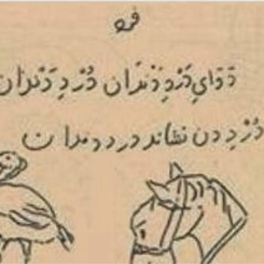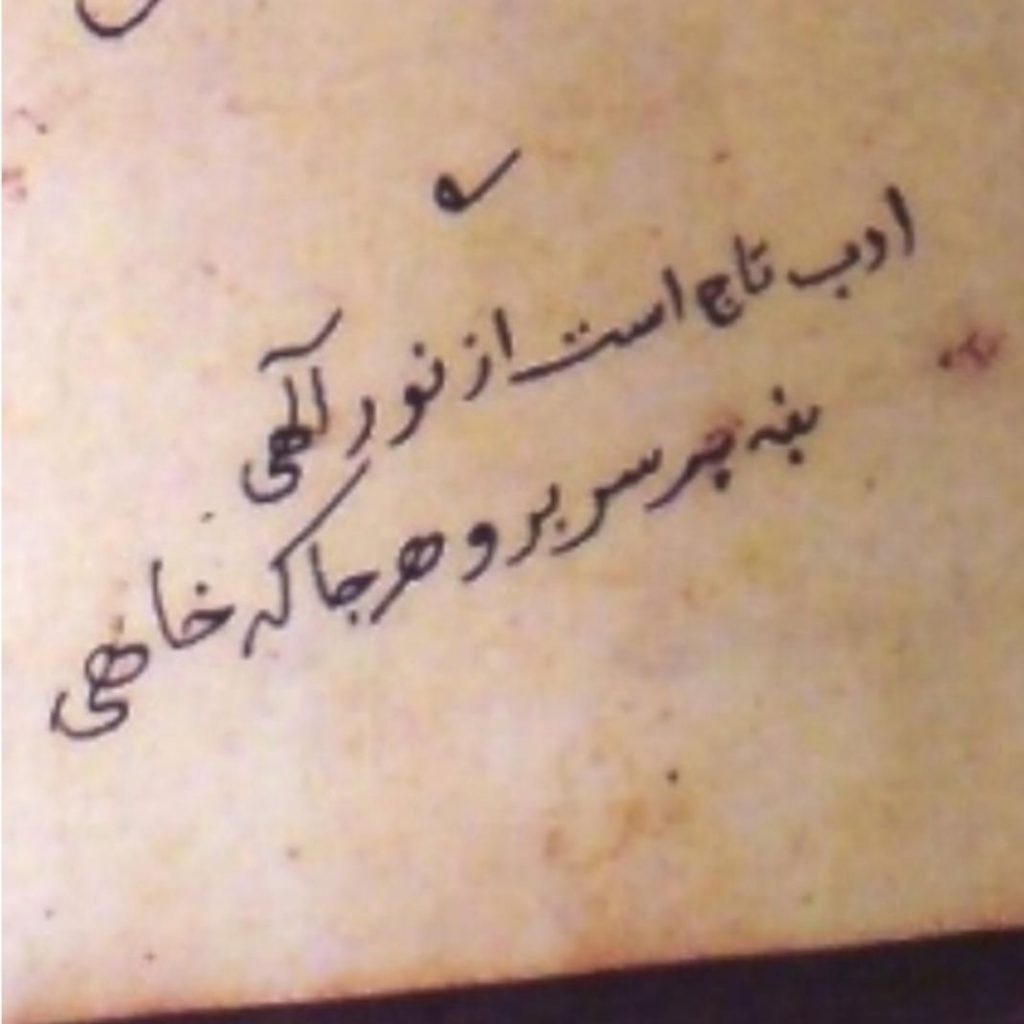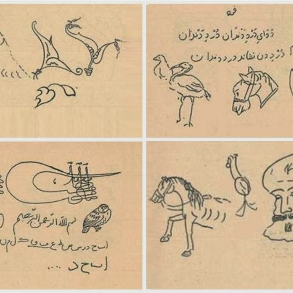 در دفترچه تمرین سلطان نوجوان، حروف یونانی و اشعار فارسی و طراحی های او از چهره اطرافیان به چشم میخورد. دو بیت فارسی در این یادداشتها توجه مرا به خود جلب کرد.