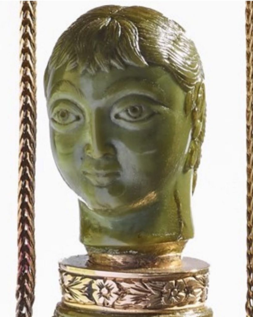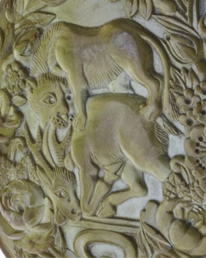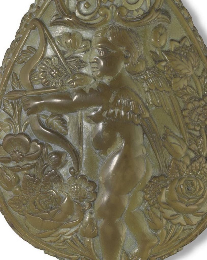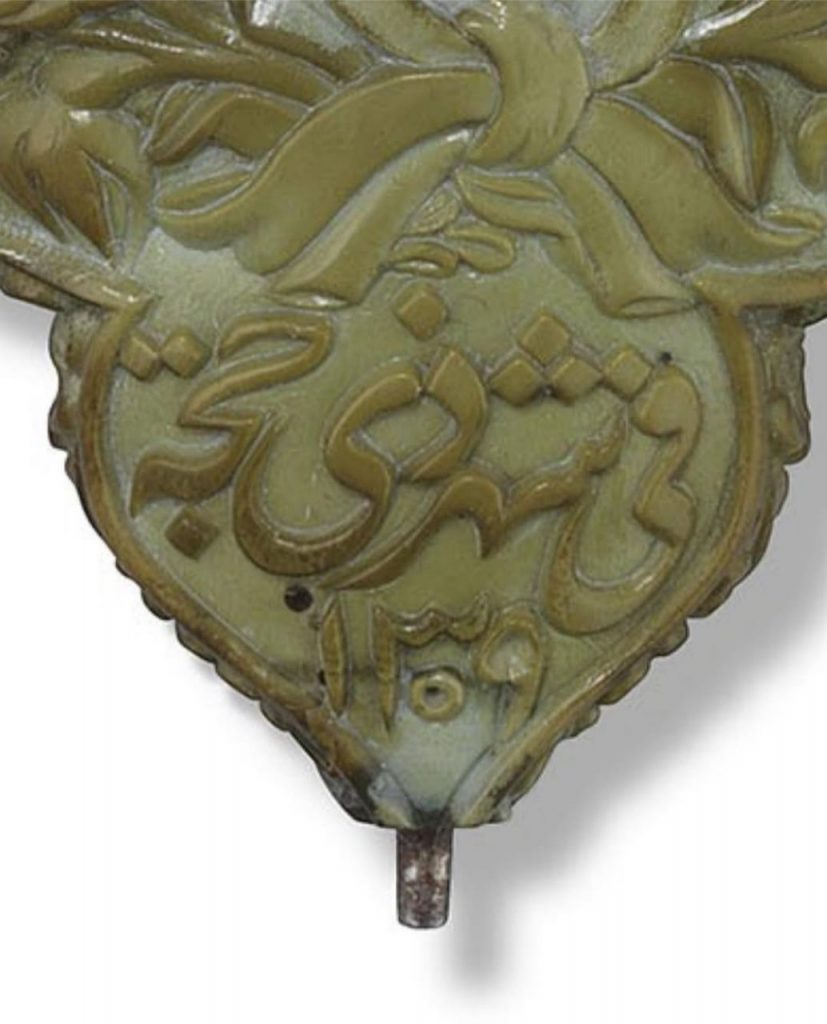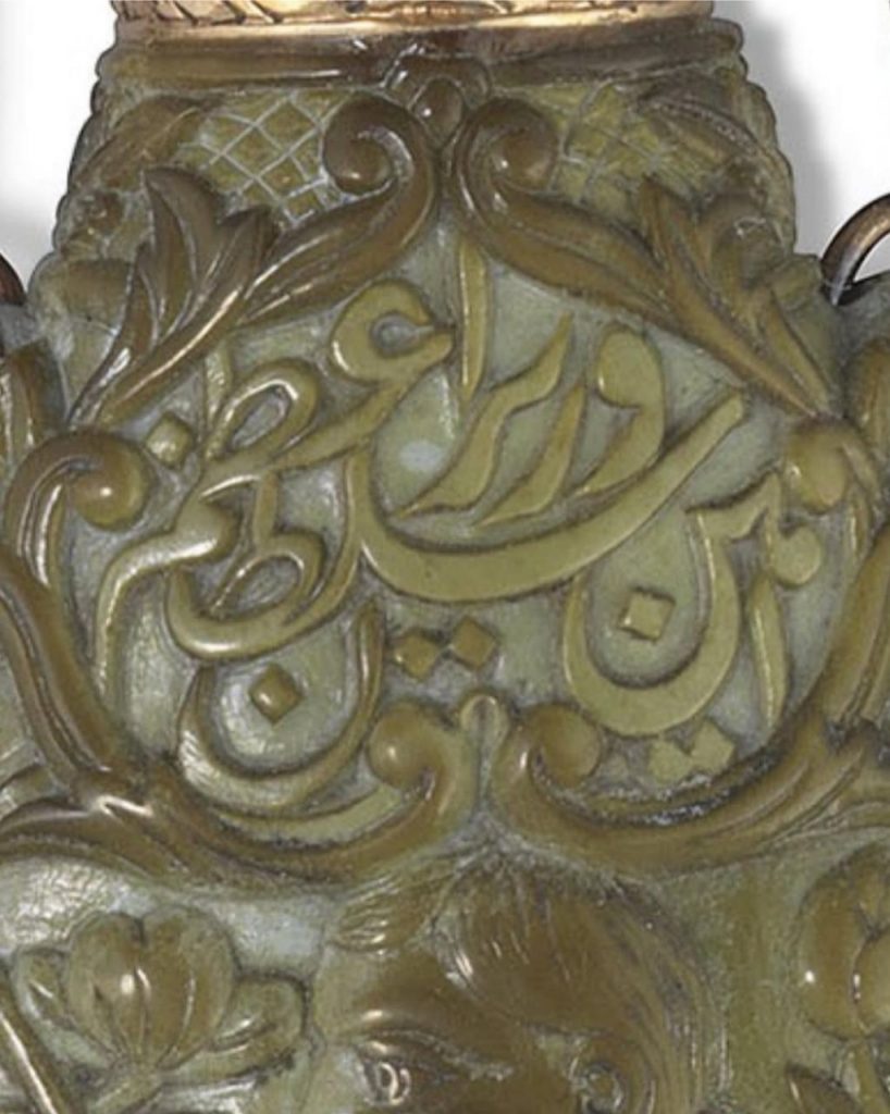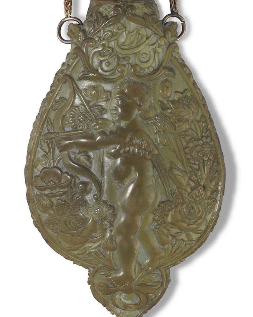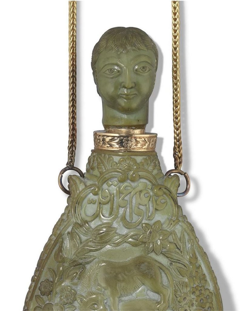 این محفظه کوچک به ارتفاع ۷ سانتیمتر از سنگ یشم تراشیده شده است. بر روی یک طرف آن فرشتهای با کمانی در دست دیده میشود و در روی دیگر نقش گرفت و گیرِ شیر و آهو. درِ ظرف به شکل سر انسان است. در کتیبه بالای سرِ فرشته عبارت «امینالسلطان وزیر اعظم» نقش بسته و در کتیبه بالای نقش شیر و آهو، امضای هنرمند، «عمل اقل غلام علی» به چشم میخورد. در پایین ترین قسمت، تاریخ «فی شهر ذی حجه ۱۳۰۹» درج شده است که در آن زمان میرزا علی اصغر خان اتابک، ملقب به امین السلطان، هنوز وزیر اعظم ناصرالدین شاه بود و لقب صدر اعظمی نگرفته بود و سالها مانده بود تا با تیر «عباس صراف تبریزی» در میدان بهارستان کشته شود.