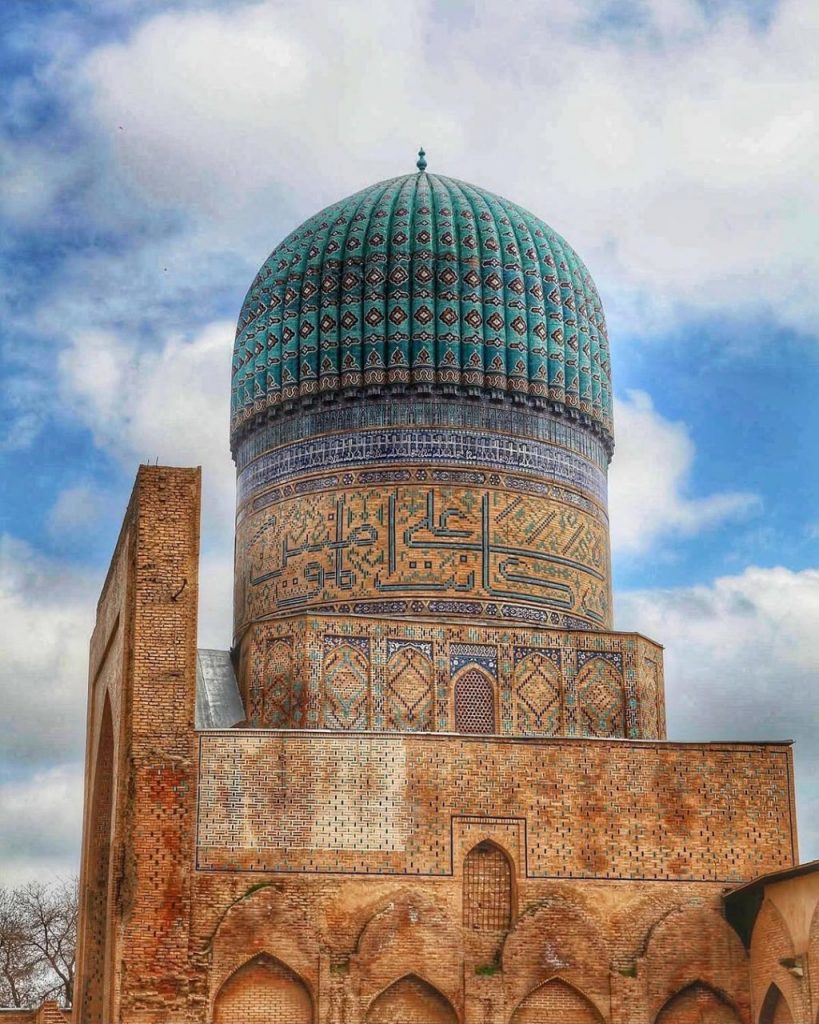 تیمور، گور خودش را در شهر سبز ساخته بوده و چیزی که ما اینجا دیدیم گوری بوده که برای نوهاش ساخته بوده ولی مرگ نابههنگامش درسفر برای فتح چین باعث میشود که جسد را برگردانند و به خاطر زمستان اینجا به خاک بسپارند و در حقیقت این مکان گورِ تیمور میشود. در دو طرف این بنا یک مدرسه و خانقاه بوده که هر دو کاملاً از بین رفته و فقط فونداسیونشان مانده بود و یک سردر بود که عمل ” معمار اصفهانی” بود که اسمش را خوشبختانه روی سردر بنا حک کرده بودند. بنا گنبد خیاره دار معروف دوره تیموری را داشت به علاوه دو مناره که منارهها در مرور زمان کوتاهتر شده بودند و دو مناره ورودی هم به کل از میان رفته بود.