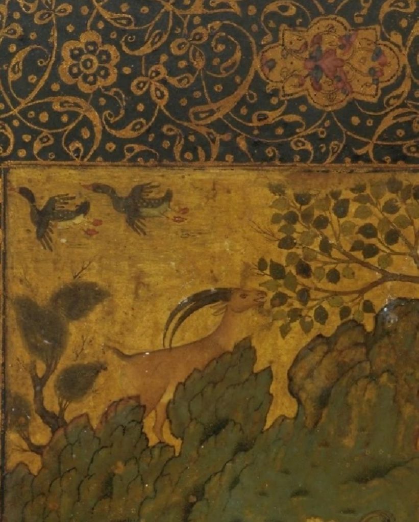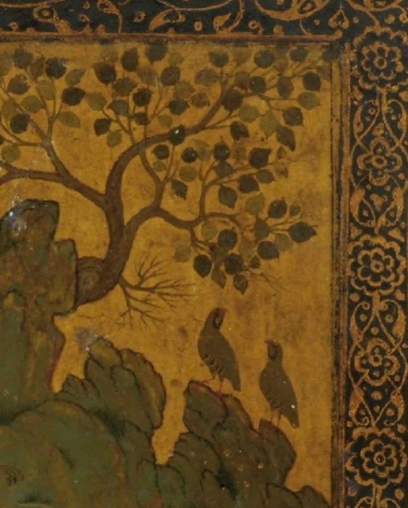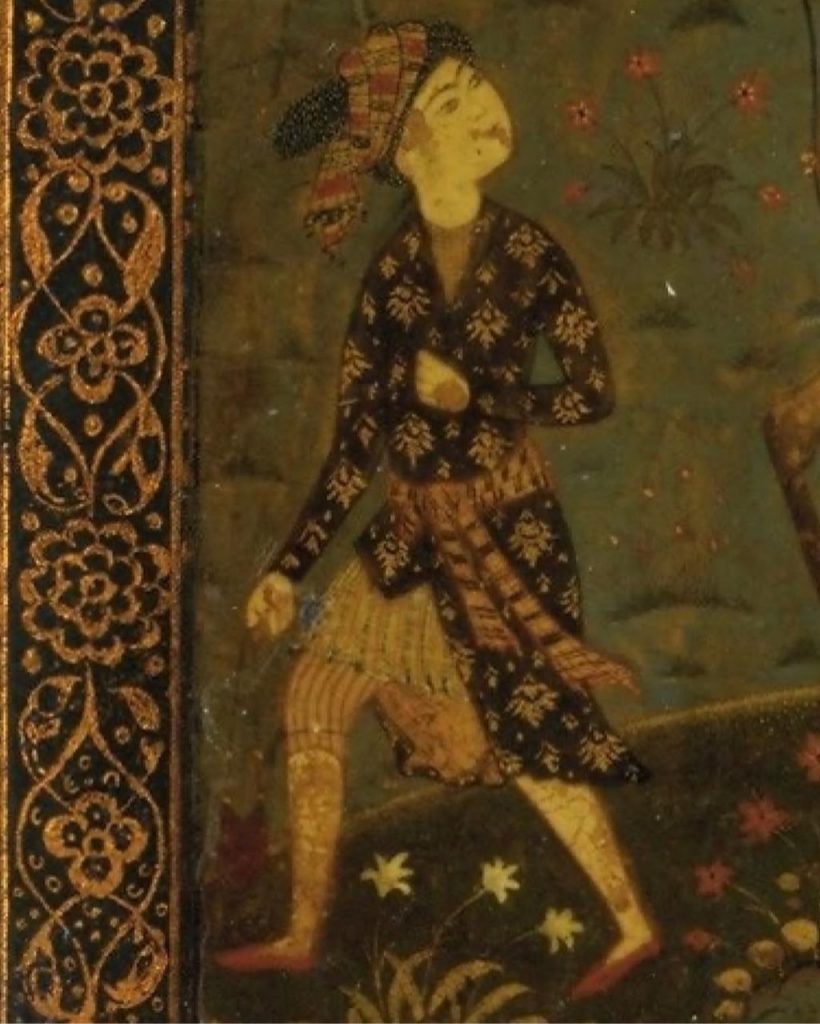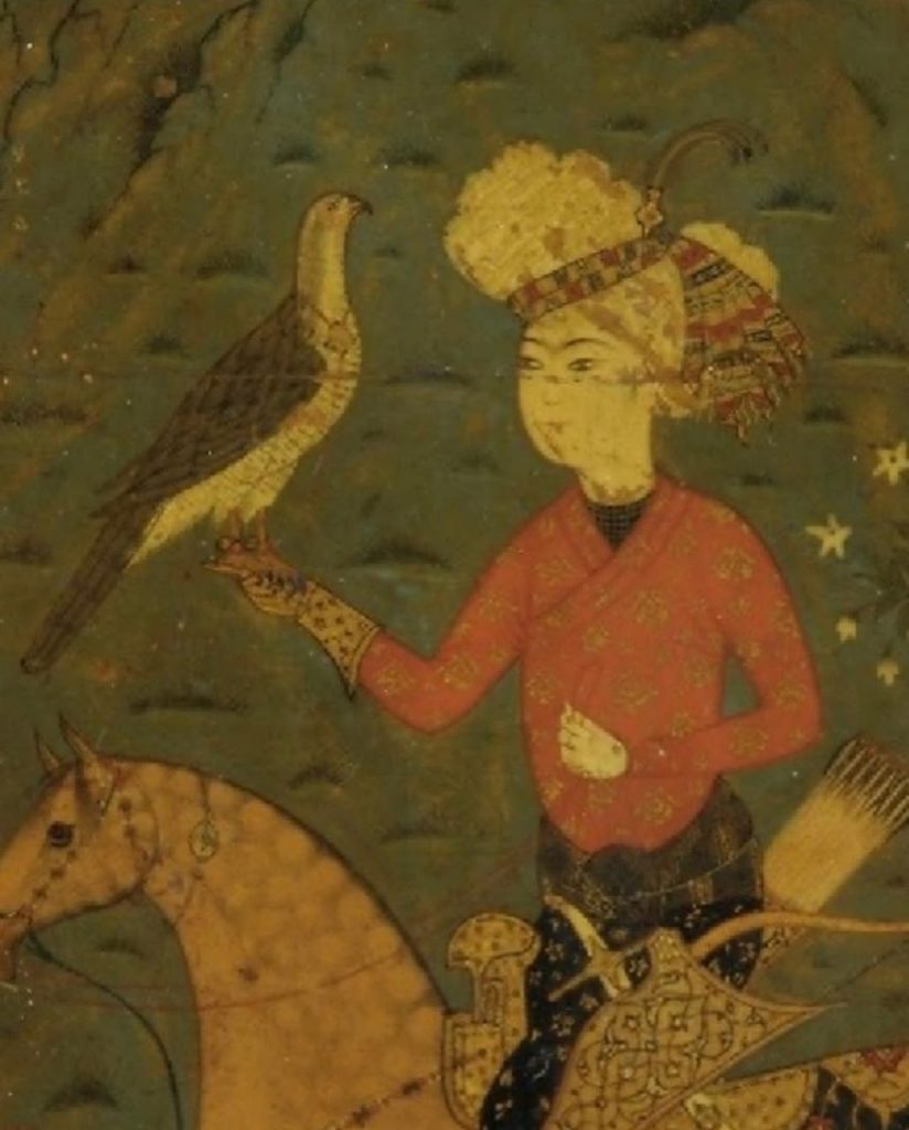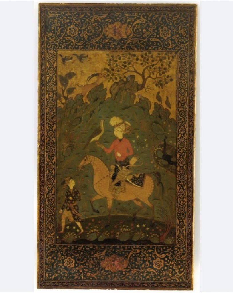 شاهزادهای با شاهینی بر دست، سوار بر اسب است و ملازمش در پیش او پیاده میرود. به سنت نقاشی صفوی، دقت بسیار در تصویر کردن لباسها و تزئینات پارچهی روی اسب و کمان دان به کار رفته، آسمان نیز به روش مرسوم آن دوره طلایی رنگ است. جلدی بدین نفیسی قطعا بر روی کتابی بوده که خود شاهکار خطاطی و تذهیب و کاغذ سازی بوده و به کتابخانه سلطنتی یا یکی از اشراف آن دوره تعلق داشته است.