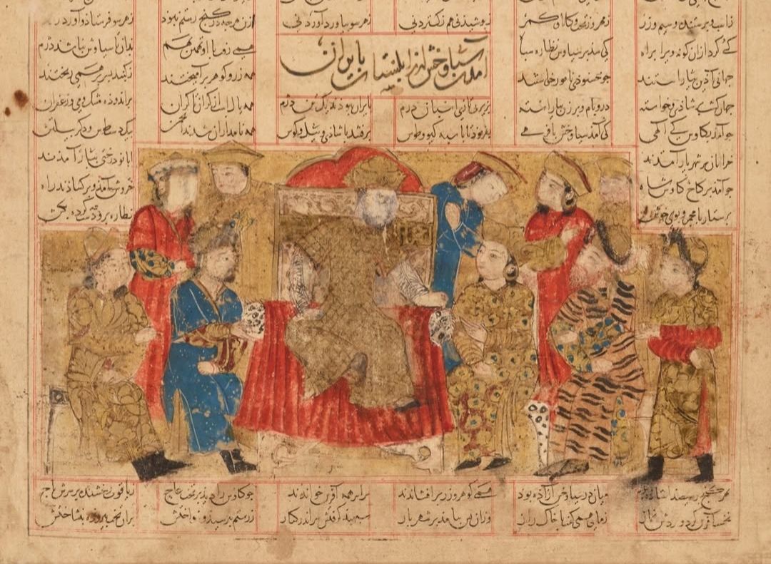 برگی از شاهنامه فردوسی، متعلق به دوره ایلخانی که به دستور حکمرانان اینجو در فارس پدید آمده است.نقاشی کیکاوس را بر تخت عاج نشان میدهد که سیاوش (در این شاهنامه سیاوخش) سمت چپ در زیر دست شاه نشسته و پشت سر او رستم با خفتان ببر بیان به چشم میخورد. در سمت راست، گیو و طوس نشستهاند و دیگر ملازمان در گرداگرد ایشان. این شاهنامه به سفارش دربار ابواسحاق، شاه حامی ادب و هنر در رمضان ۷۴۱ هجری به نگارش درآمده است.در خیالم میاندیشم که شاید حافظ که در این زمان ۱۴ ساله بوده بعدها این کتاب را در کتابخانه…