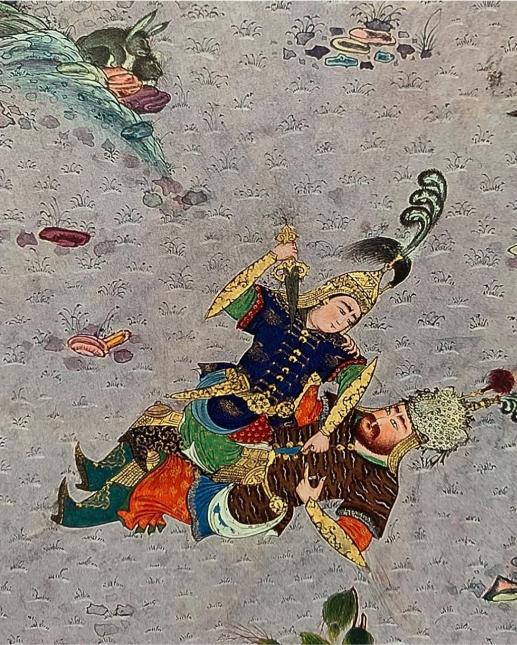 نقاشی اول با عنوان کشتی گرفتن رستم با سهراب تصویرگر لحظهایست که سهراب در نبرد پشت رستم را به زمین میرساند و خنجر از نیام میکشد که او را بکشد. رستم با نیرنگی به سهراب میگوید رسمِ دیارِ ما این است که حداقل دو بار پشت حریف را به خاک برسانیم بعد او را بکشیم و سهراب با جوانمردی رهایش میکند. نقاشی این صفحه مملو از رنگهای شاد و چشم نواز است و در ترکیببندی آن، نگاه، اول از همه بهسهرابِ نشسته بر سینه رستم میرسد. دو مهتر در طرفین اسبان که کمانهای دو پهلوان را نگهداشته اند و صحنه…