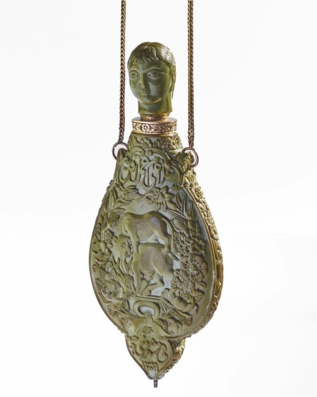 این محفظه کوچک به ارتفاع ۷ سانتیمتر از سنگ یشم تراشیده شده است. بر روی یک طرف آن فرشتهای با کمانی در دست دیده میشود و در روی دیگر نقش گرفت و گیرِ شیر و آهو. درِ ظرف به شکل سر انسان است. در کتیبه بالای سرِ فرشته عبارت «امینالسلطان وزیر اعظم» نقش بسته و در کتیبه بالای نقش شیر و آهو، امضای هنرمند، «عمل اقل غلام علی» به چشم میخورد. در پایین ترین قسمت، تاریخ «فی شهر ذی حجه ۱۳۰۹» درج شده است که در آن زمان میرزا علی اصغر خان اتابک، ملقب به امین السلطان، هنوز وزیر اعظم…